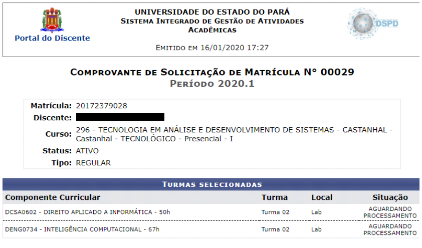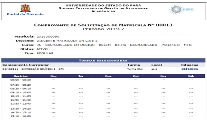 - O sistema exibirá o comprovante de matricula do discente, o mesmo poderá ser impresso.