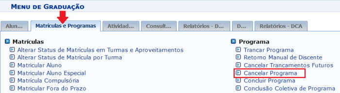 - 1) Vá no caminho SIGAA > Graduação > Matrículas e Programas > Programa > Cancelar Programa:
