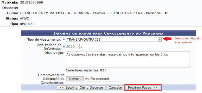 - Caso desejar, também poderá ser anexado o comprovante da solicitação de cancelamento (opcional). Após inserir as informações, clique em “Próximo Passo”: