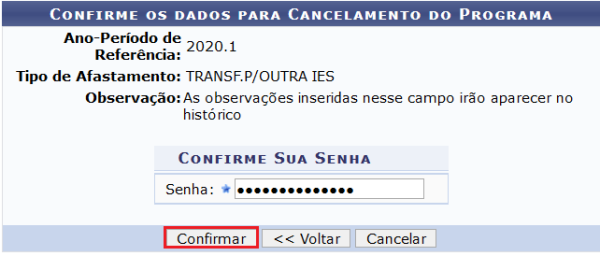 - 4) Confirme a operação inserindo a senha e clicando na opção “Confirmar”: