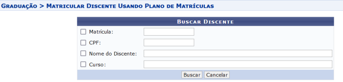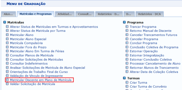 Para realizar esta operação, acesse o SIGAA → Módulos → Graduação → Matrículas e Programas → Matrículas → Matricular Discente em Plano de Matrícula: