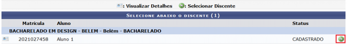 Após os resultados exibidos pelo sistema, o usuário deverá clicar na opção para selecionar o discente a ter sua atividade registrada: