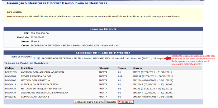 Após selecionar o discente, o usuário será direcionado para a tela onde deverá selecionar o plano de matrícula se existir mais de um plano criado. Caso tenha apenas um plano de matrícula, o sistema já irá trazer selecionado, por padrão. Para prosseguir, deve-se clicar em “Avançar”: