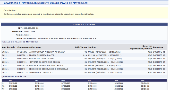 Após esse procedimento, o discente estará matriculado em todas as turmas do plano de matrícula para ingressantes. O aluno também passará do status CADASTRADO para ATIVO dentro do sistema.