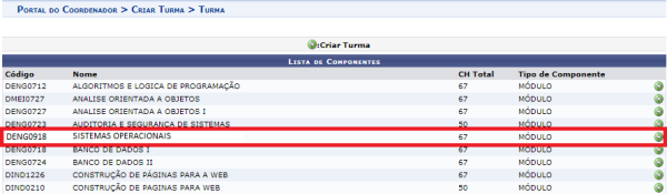 - Ao clicar em Criar Turma, uma tela com a lista de todos os componetes curriculares presentes no curso será exibida.