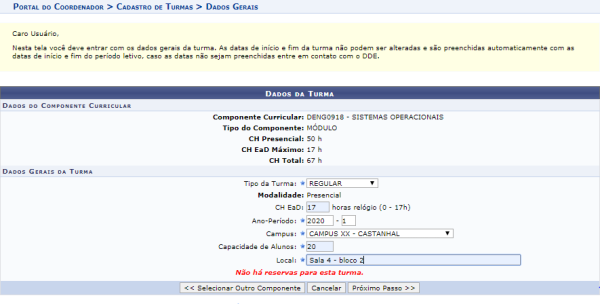 O sistema exibirá uma tela solicitando as seguintes informações gerais sobre a turma: