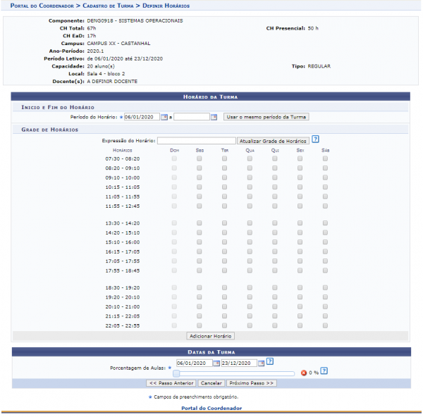 Observação: É importante ressaltar que o usuário apenas irá definir os horários voltados a Carga Horária Presencial.