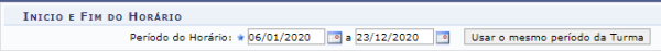 Na seção Início e Fim do Horário, o usuário poderá definir o período do horário, inserindo manualmente ou clicando em Usar o mesmo período da Turma.