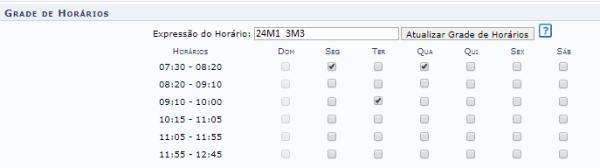Na seção Grade de Horários, o usuário poderá definir os horários em que o componente curricular será ministrado. Isso poderá ser feito clicando nos espaços correspondentes ou usando a Expressão do Horário.