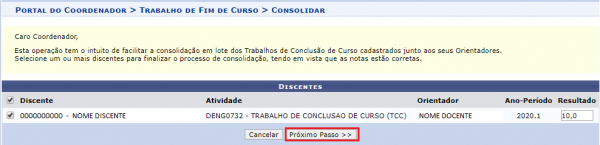 - Selecione o discente que deverá ter sua nota consolidada e clique em Próximo Passo ». A seguinte tela será exibida: