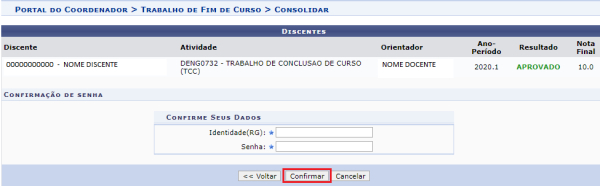 - Ao clicar em Consolidar o Trabalho de Conclusão de Curso será exibida uma tela com a lista dos discentes, orientadores e a nota cadastrada.