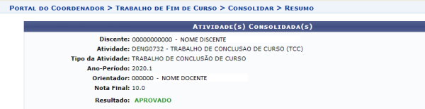 - Observação: Após confirmar a operação, a atividade do tipo Trabalho de Conclusão de Curso estará consolidada para o discente e a nota aparecerá no histórico desse aluno.