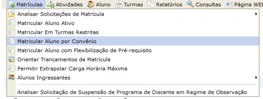 - Seguir para Matrículas » Matricular aluno por convênio.