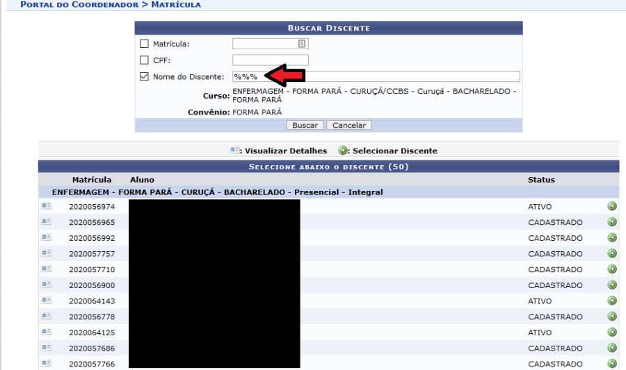 - A tela mostra uma ferramenta de busca para encontrar o aluno que deseja matricular, caso queira visualizar todos os alunos que estão no curso, escrever 3 porcentagens(“%%%”) na caixa de busca por “Nome do discente” e em seguida clicar em “buscar”, após isso clicar na setinha verde que aparece no aluno que você deseja matricular.