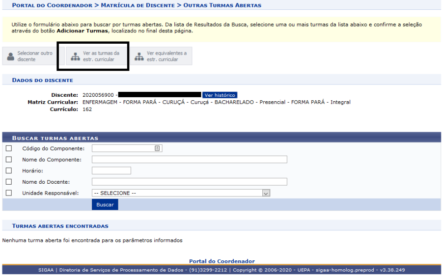 - Na tela seguinte, você poderá pesquisar a disciplina(que no SIGAA é chamada de Turma), caso não deseje buscar a disciplina, clicar em: “Ver as turmas da estr. curricular”.