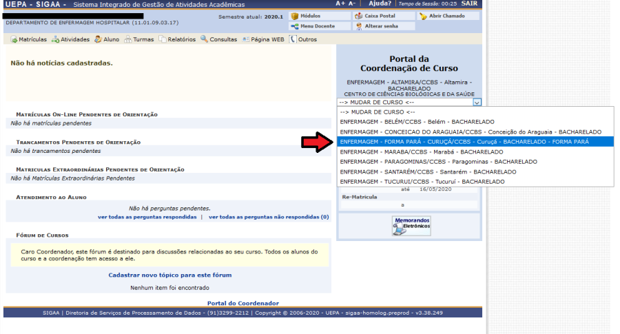 - Depois mudar o acesso ao curso para escolher a coordenadoria correta.