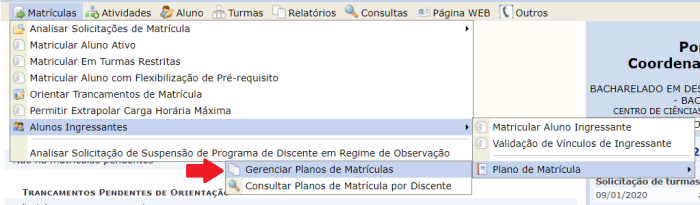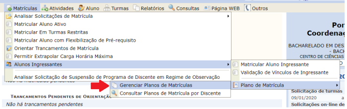 - Como coordenador, acesse o caminho SIGAA > Portal Coord.Graduação > Matrículas > Alunos Ingressantes > Plano de Matrícula > Gerenciar Plano de Matrículas: