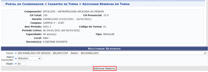 - O coordenador cria a turma no caminho SIGAA > Portal Coord. Graduação > Turmas > Criar Turma. No momento da criação da turma, há a opção de informar se a turma terá reserva de vagas para algum curso. Nesse momento, a reserva pode ser realizada:
