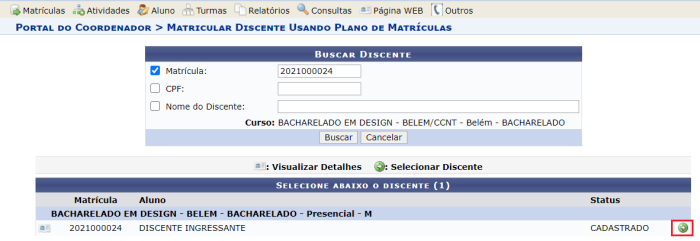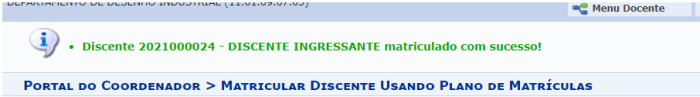 - O sistema retornará uma mensagem, no topo da tela, informando que a operação foi realizada com sucesso e o discente passará do status CADASTRADO para ATIVO: