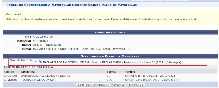 - Confirme o plano de matrícula selecionado. Caso tenha mais de um plano de matrícula para matriz, deverá ser selecionado o plano correto. Clique em “Avançar” para prosseguir na matrícula:
