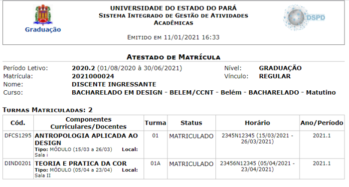 - Também será possível consultar o atestado de matrícula do aluno clicando em “Atestado de Matrícula”, no final da operação da matrícula dos discentes ingressantes, e verificar suas matrículas: