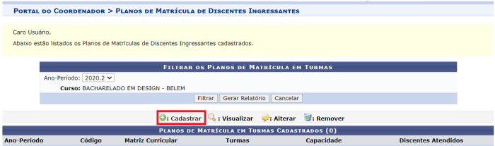 O plano de matrícula pode ser cadastrado em SIGAA > Portal Coord.Graduação > Matrículas > Alunos Ingressantes > Plano de Matrícula > Gerenciar Plano de Matrículas: