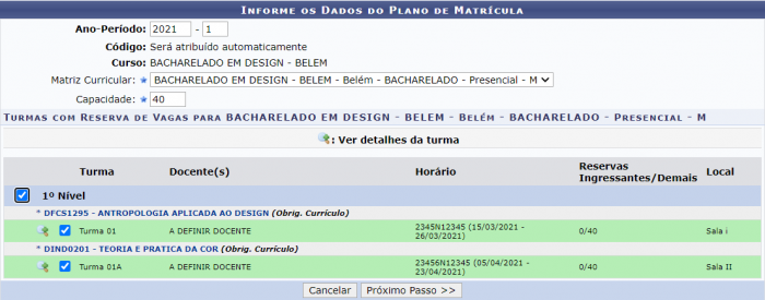 - Antes de realizar a matrícula dos ingressantes, é necessário criar as turmas realizando a reserva de vagas necessária para o curso. Geralmente, o plano de ingressantes é criado com os componentes curriculares do primeiro nível da estrutura curricular do curso.