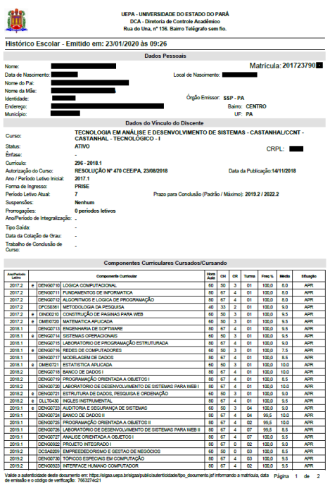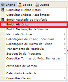 - Para emitir o histórico acadêmico, o discente deverá acessar o menu Ensino » Emitir Histórico