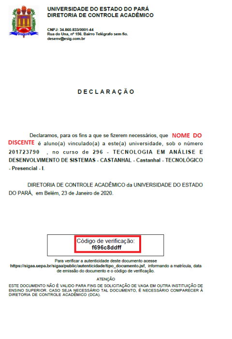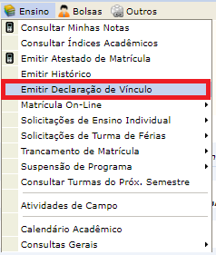 - Para emitir a declaração de vínculo com a UEPA, o discente deverá acessar o menu Ensino » Emitir Declaração de Vínculo.