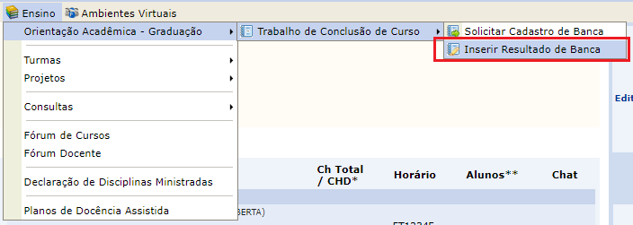 - Para inserir os resultados da Banca de Defesa de TCC, acesse o SIGAA UEPA » Módulos » Portal Docente » Orientação Acadêmica – Graduação » Trabalho de Conclusão de Curso » Inserir Resultado de Banca.