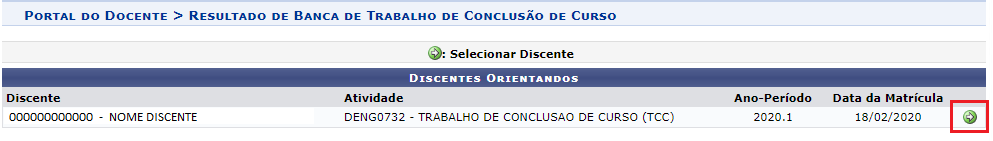 - Ao clicar em Inserir Resultado de Banca será exibida uma tela com a lista dos discentes orientandos pelo Docente que já possuem banca com solicitação aprovada pela coordenação.
