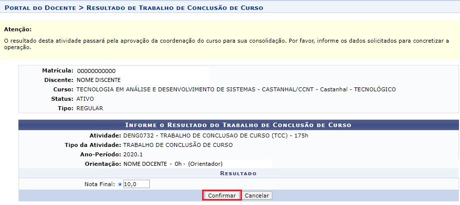 - O docente deverá informar a nota final do Trabalho de Conclusão de Curso e clicar em Confirmar.