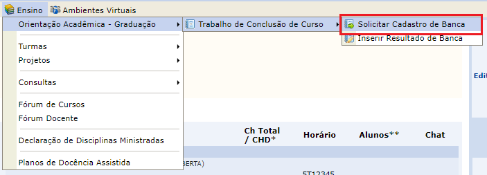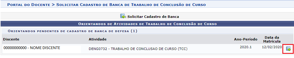 Clique no ícone para solicitar o cadastro da banca de defesa de um discente.