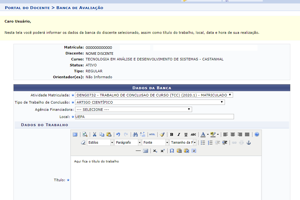 Observação: É importante ressaltar que o nome do trabalho aparecerá no histórico do discente.