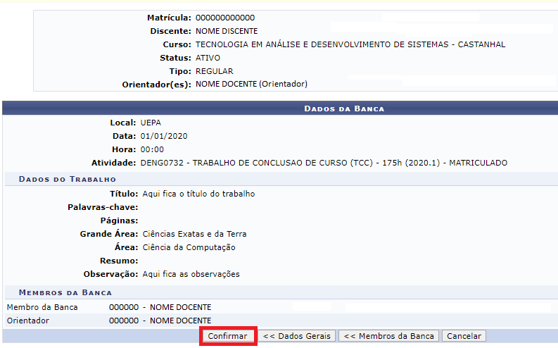 O sistema exibirá uma tela com as informações cadastradas da banca para serem confirmadas: