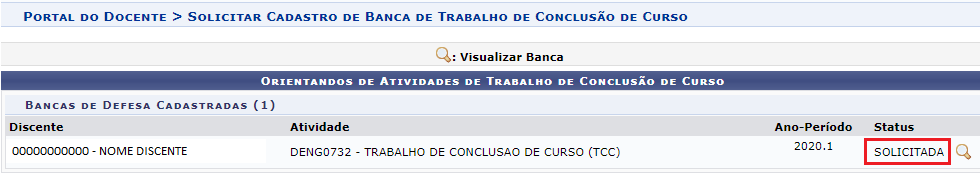 E o status da banca cadastrada ficará como SOLICITADA, pois ainda necessita de aprovação da coordenação do curso.