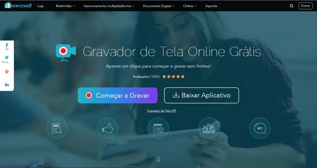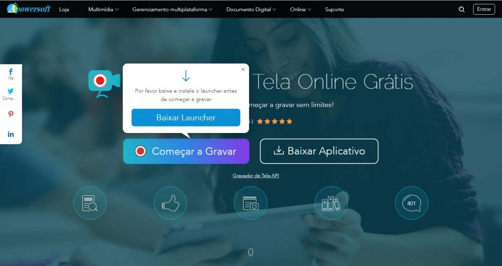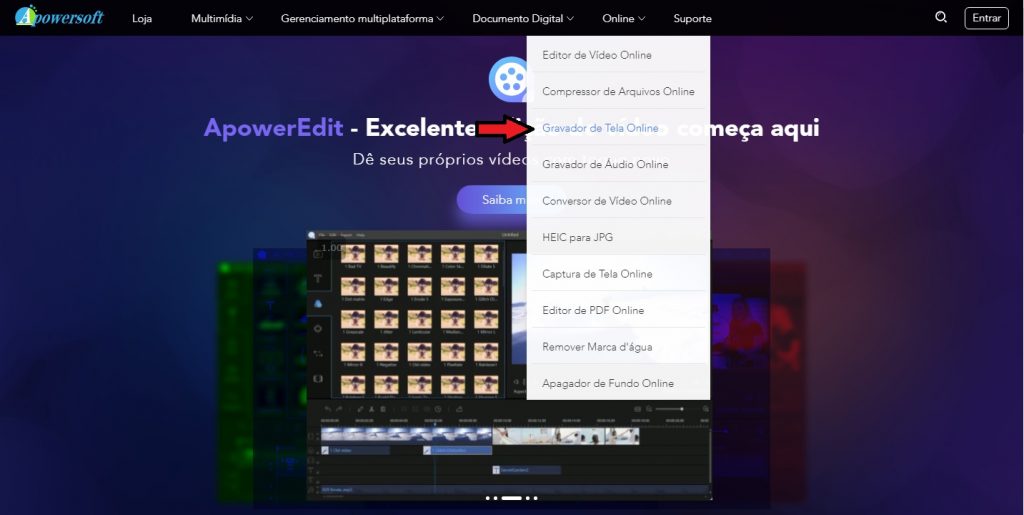 - Passo 01: Acesse o link https://www.apowersoft.com.br/ ou digite o site no seu navegador, em seguida vá até a guia “Online” e click na opção “Gravador de Tela Online”.