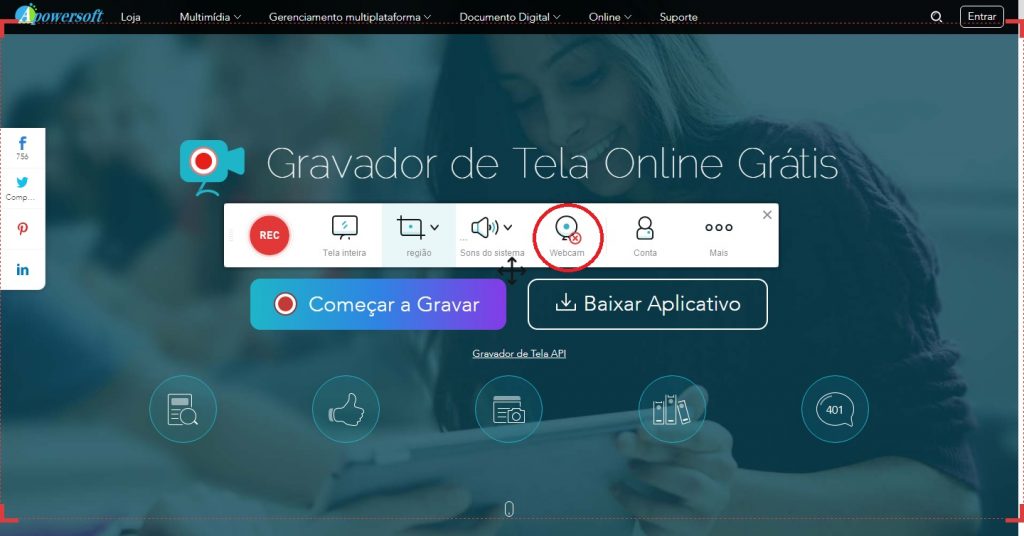 - Passo 08: É possível ainda habilitar ou não a webcam do computador na opção “Webcam”. Caso seja habilitada, a ferramenta disponibilizará um pequeno quadro com a imagem a ser gravada, esse quadro pode ser movido de acordo a necessidade.