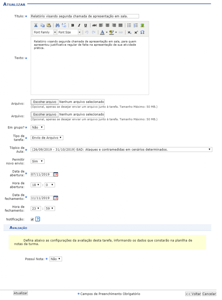 - Tipo de tarefa: Escolha, dentre as opções, o tipo de tarefa a ser criada: Envio de Arquivo, Trabalho Online, Trabalho Offline;