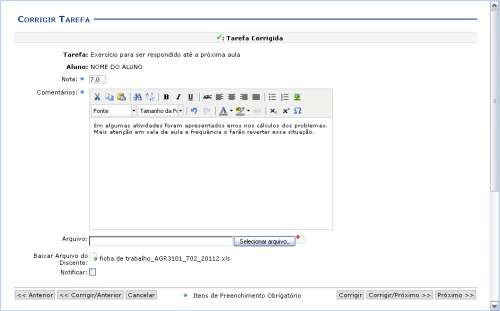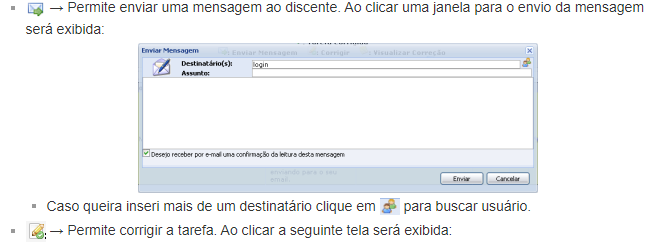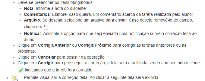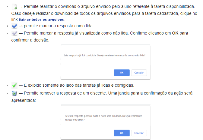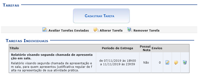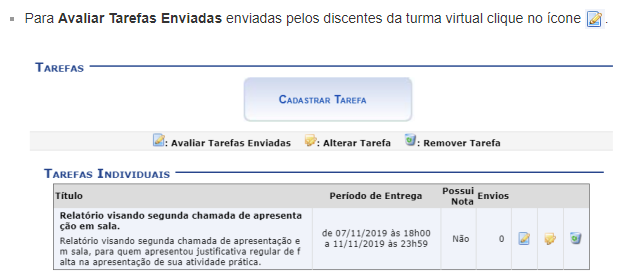- Esta funcionalidade permite que o docente responsável pela turma virtual possa cadastrar tarefas, corrigi-las, de acordo com a demanda de respostas dos alunos, além de alterar e/ou remover as atividades já cadastradas.
