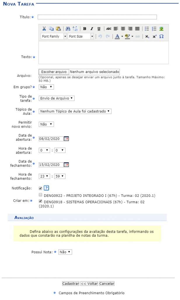 - Unidade: Escolha a qual unidade do semestre refere-se a tarefa;
