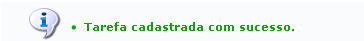 - Após o preenchimento dos campos requeridos pelo sistema, clique em Cadastrar para prosseguir com a criação da tarefa. A seguir, o sistema retornará à tela de Tarefas contendo a mensagem de sucesso da tarefa criada: