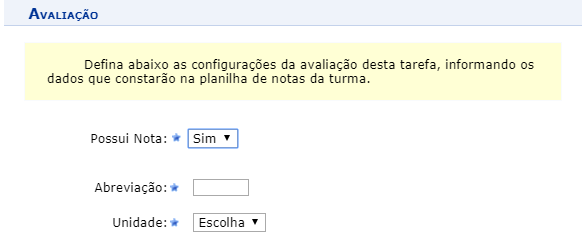 - Na parte destinada à Avaliação, defina as configurações da avaliação da tarefa, informando os dados que constarão na planilha de notas da turma.