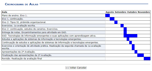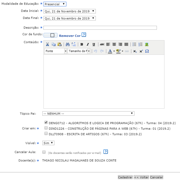 Observação 1: Se o tópico de aula já estiver cadastrado, pode-se selecionar a opção de cancelamento de aula, o qual informará os discentes via e-mail.