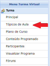 - Para acessar os tópicos de aula deve-se acessar a Turma » Tópicos de Aula.