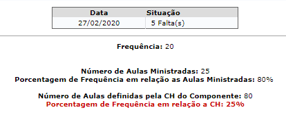 Observação 2: Há um limite máximo para faltas de cada aluno, ultrapassando esse limite o discente estará reprovado por falta na disciplina. Por isso, fique sempre atento a Porcentagem de Frequência em relação a CH e a Porcentagem de Frequência em relação as Aulas Ministradas.
